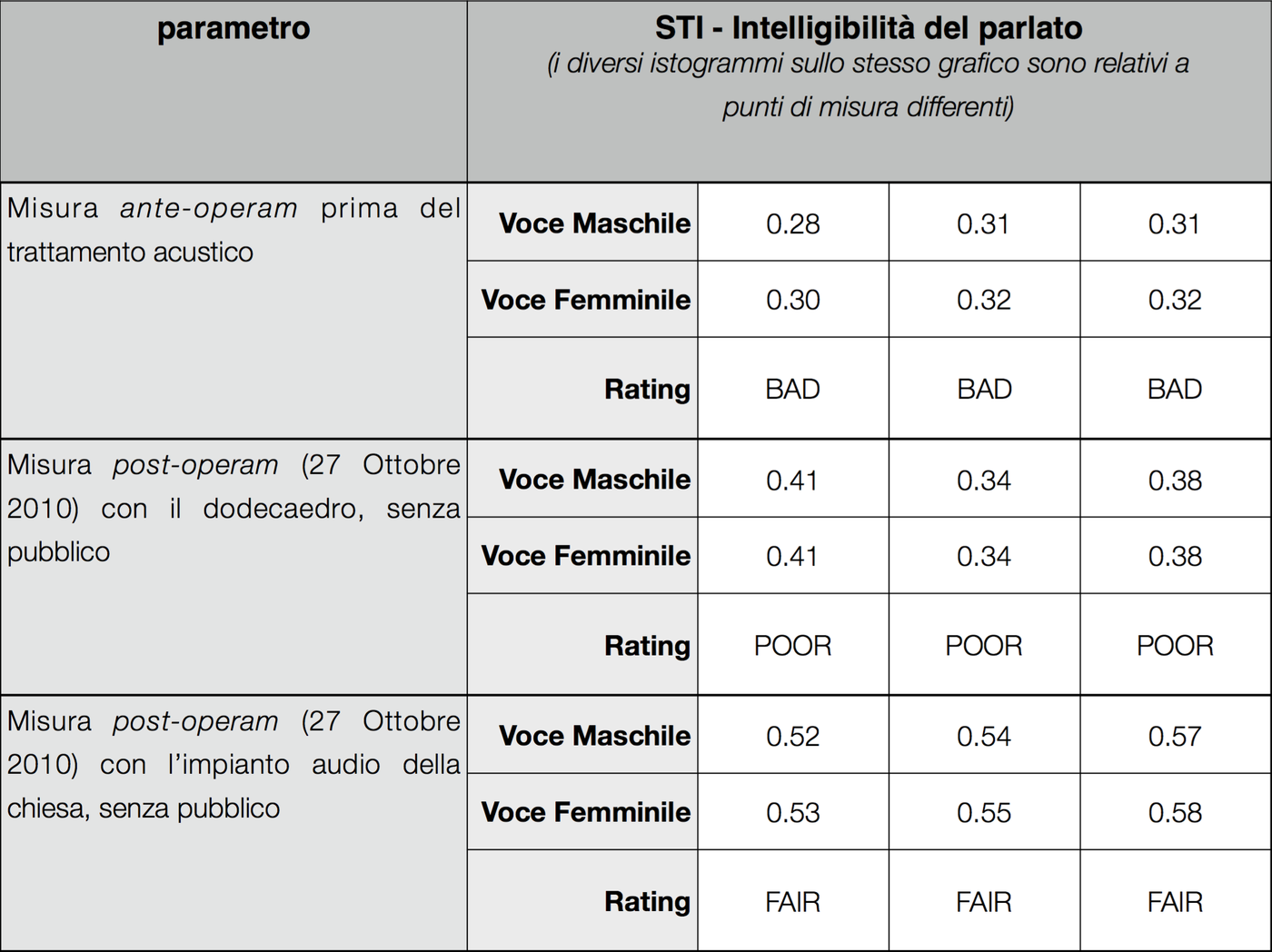 | Reverberation time | Ante-operam 11s; Post-operam 2.7s sala vuota, 1.9s sala piena |