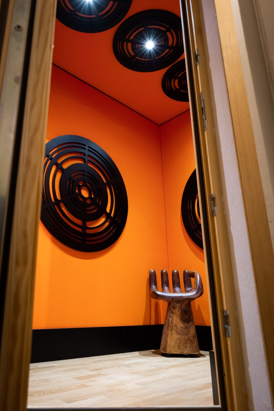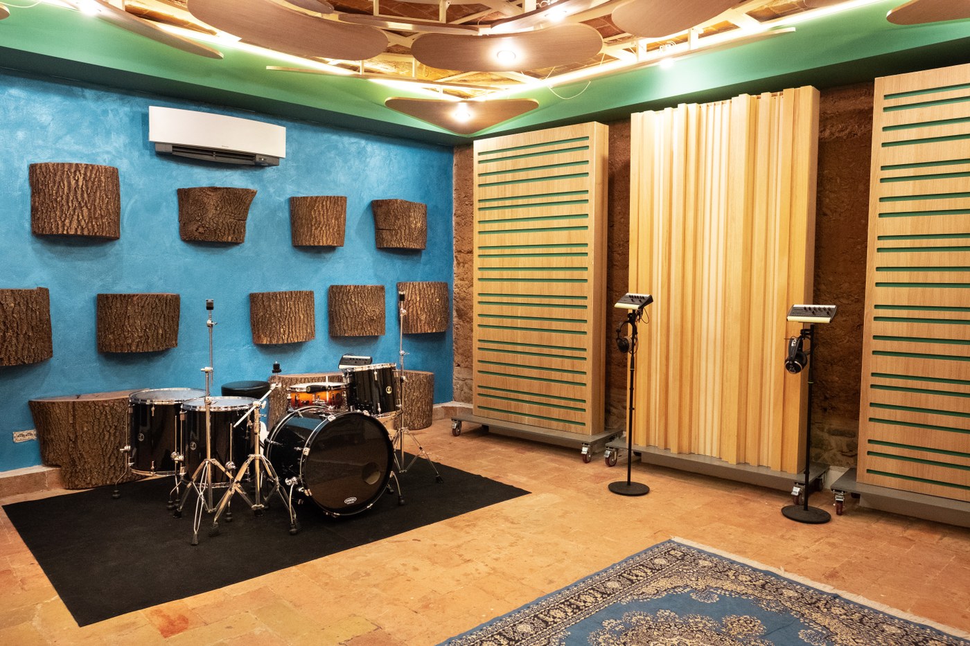 The live room has a unique character due to the use of local materials: earth, wood and terracotta. Rotating gobos panels have been set up to be able to correct and vary the acoustics of the room in various configurations of use. The gobos have an extremely diffusing part and the other absorbent and diffusing. The aim of the project was to maintain a homogeneous and highest reverberation, given the volume of the room. Instead of common poly-cylinders, solid logs were installed to optimize diffusion at medium high frequencies and, thanks to the panel's solidity, avoid absorbing further low frequencies. The ceiling, originally with terracotta vaults, has been corrected with an architectural acoustic intervention that allows to further diffuse the sound in the room, avoiding flutter-echo with the floor. The "Fiery" absorber / diffuser was taken in the center of the ceiling, making it look like a flower suspended with side petals.