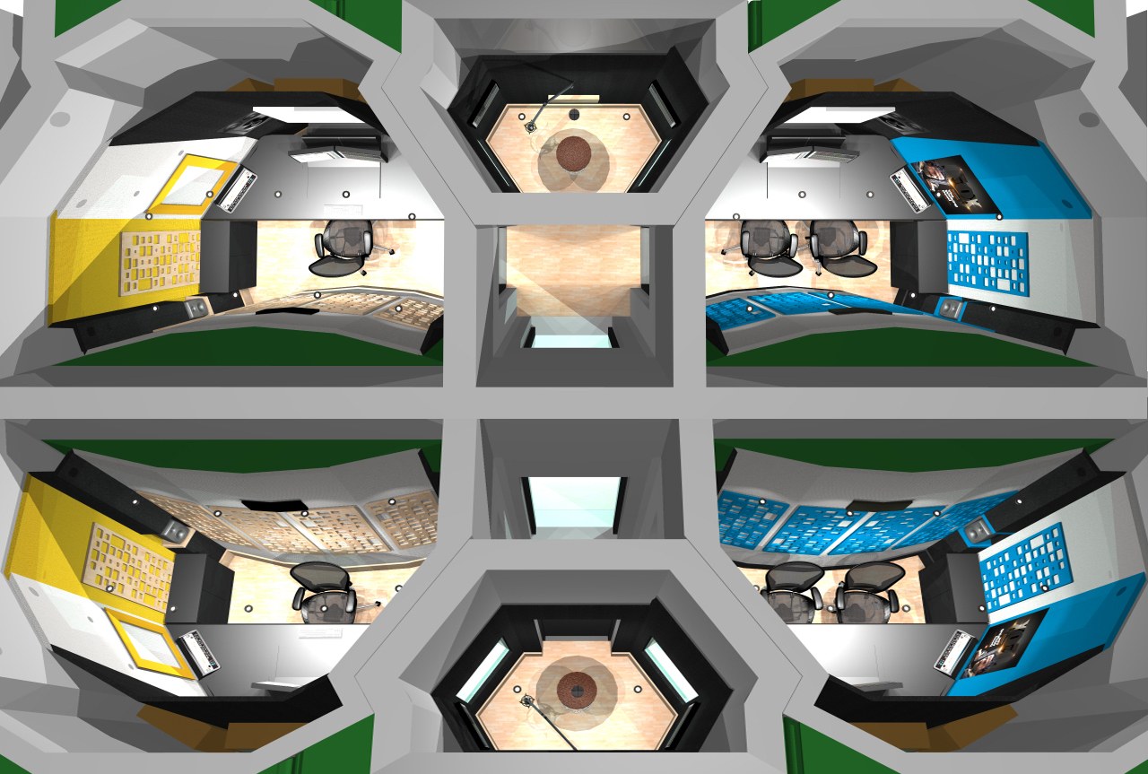 | Reverberation time | 0.15s @ 500Hz (ctrl room); 0.10s @ 500Hz (vocal booth) |