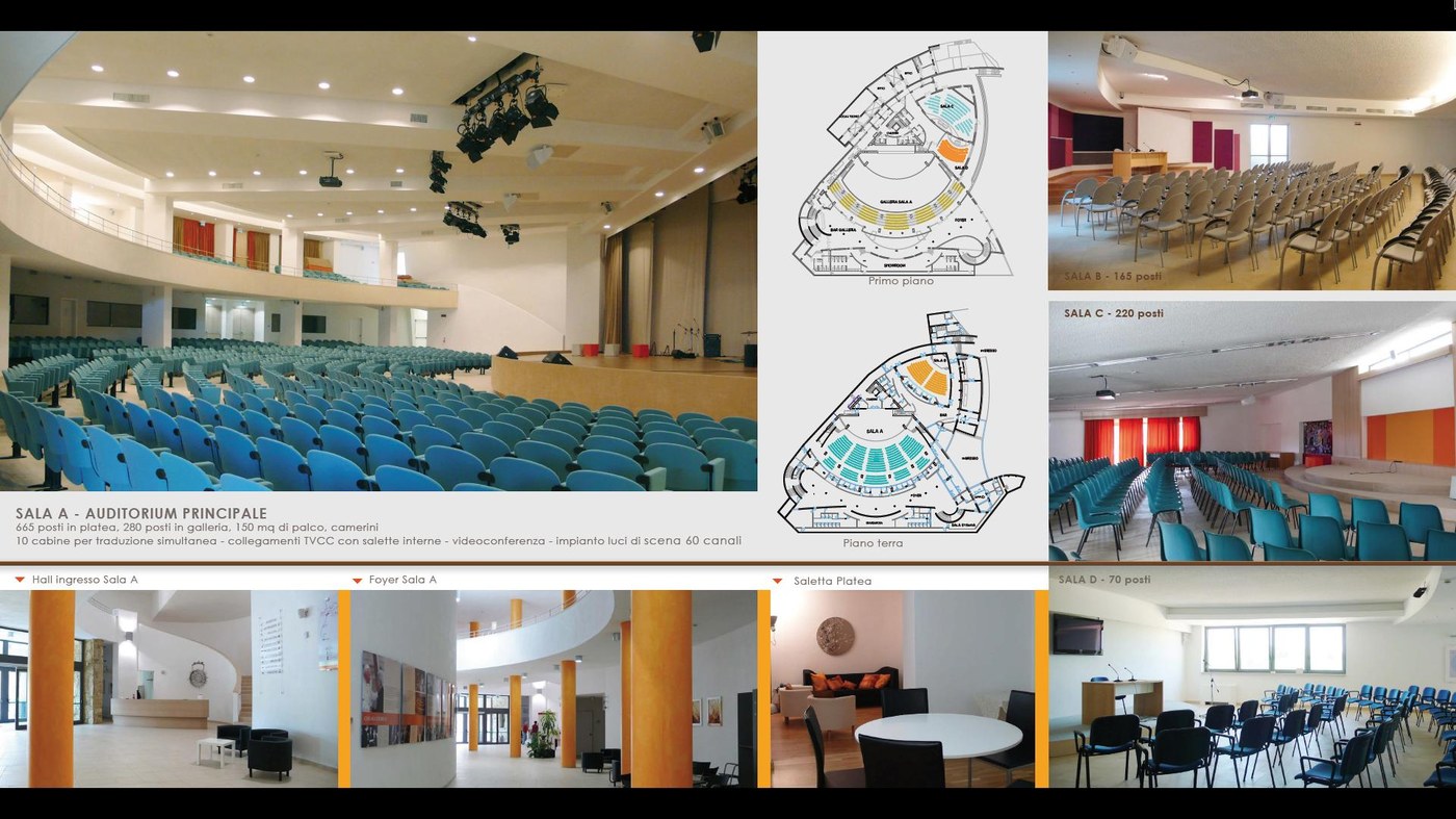 Four rooms of different sizes are equipped with the latest facilities for video-conferencing, simultaneous translation, audio and lights, internet connection in optical fiber. These allow to perform more conferences simultaneously and to host more than 1,300 participants.