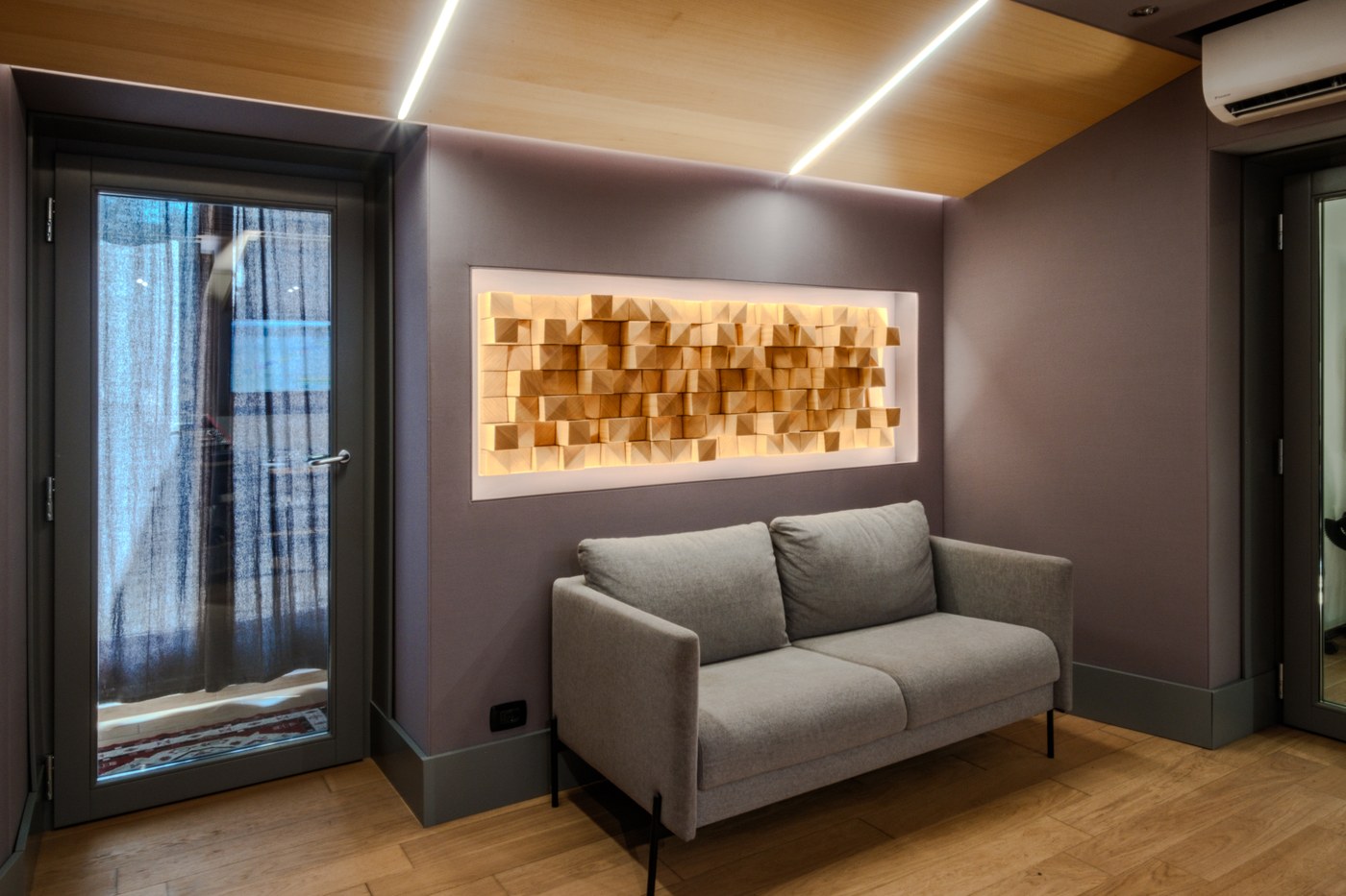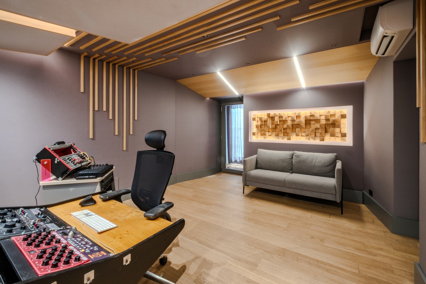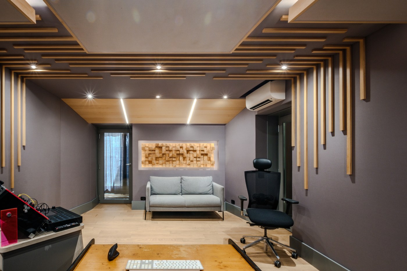 The Studio Sound Service design philosophy translated this vision into an acoustic architecture where every element serves a dual aesthetic and technical purpose. Wood is the primary material, featured in the visible diffusers—integrated at Andrea's request—and in the distinctive interplay of wooden slats that define the ceiling and walls. These individual straight lines follow a soft, curved path, generating a visual rhythm that blends precision with harmony.