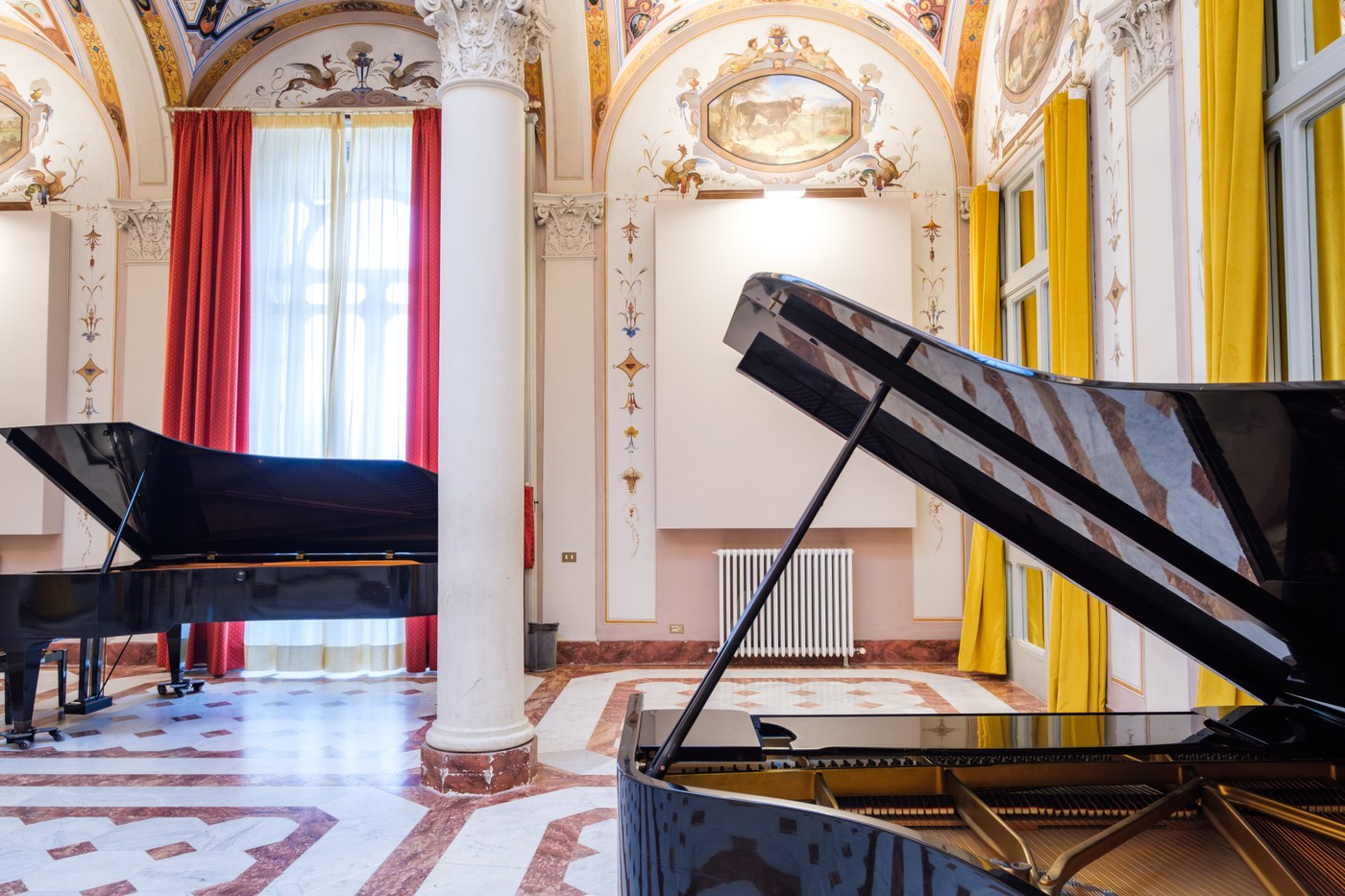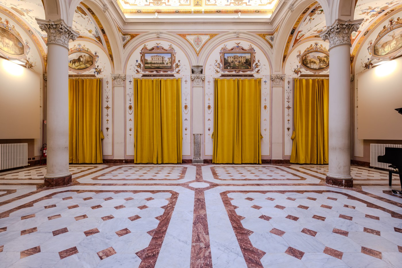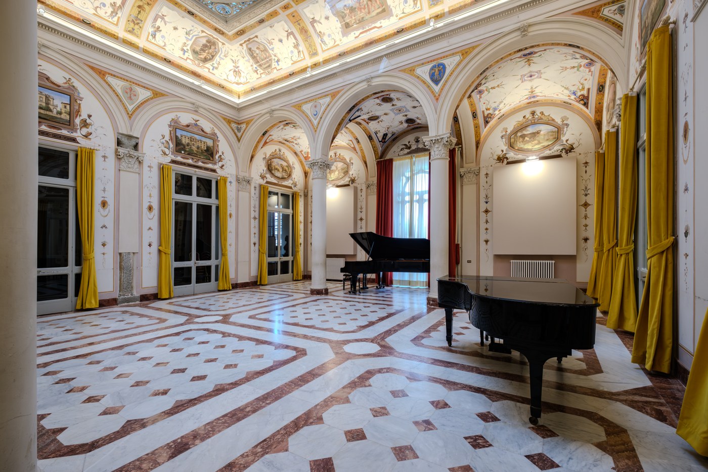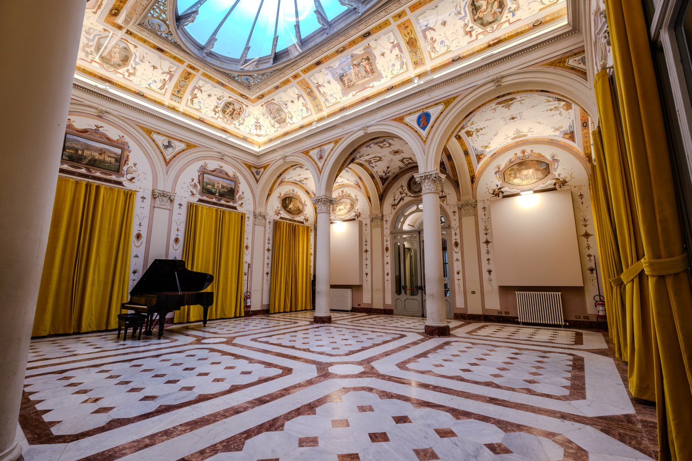 Read moreThe villa features a central hall, Sala dei Giochi, which is now used as an auditorium for Conservatory lectures and concerts. It had complex acoustics because of the central skylight that focused sound toward the center of the hall. It was treated with broad-band absorbers to contain low frequencies and with Plexiglas canopies to eliminate the phenomenon of sound focusing. The treatment is completed with a series of fire retardant velvet curtains that also give the ability to create variable acoustics in the room, which is useful for being able to play classical, opera, and even electronic works of music.