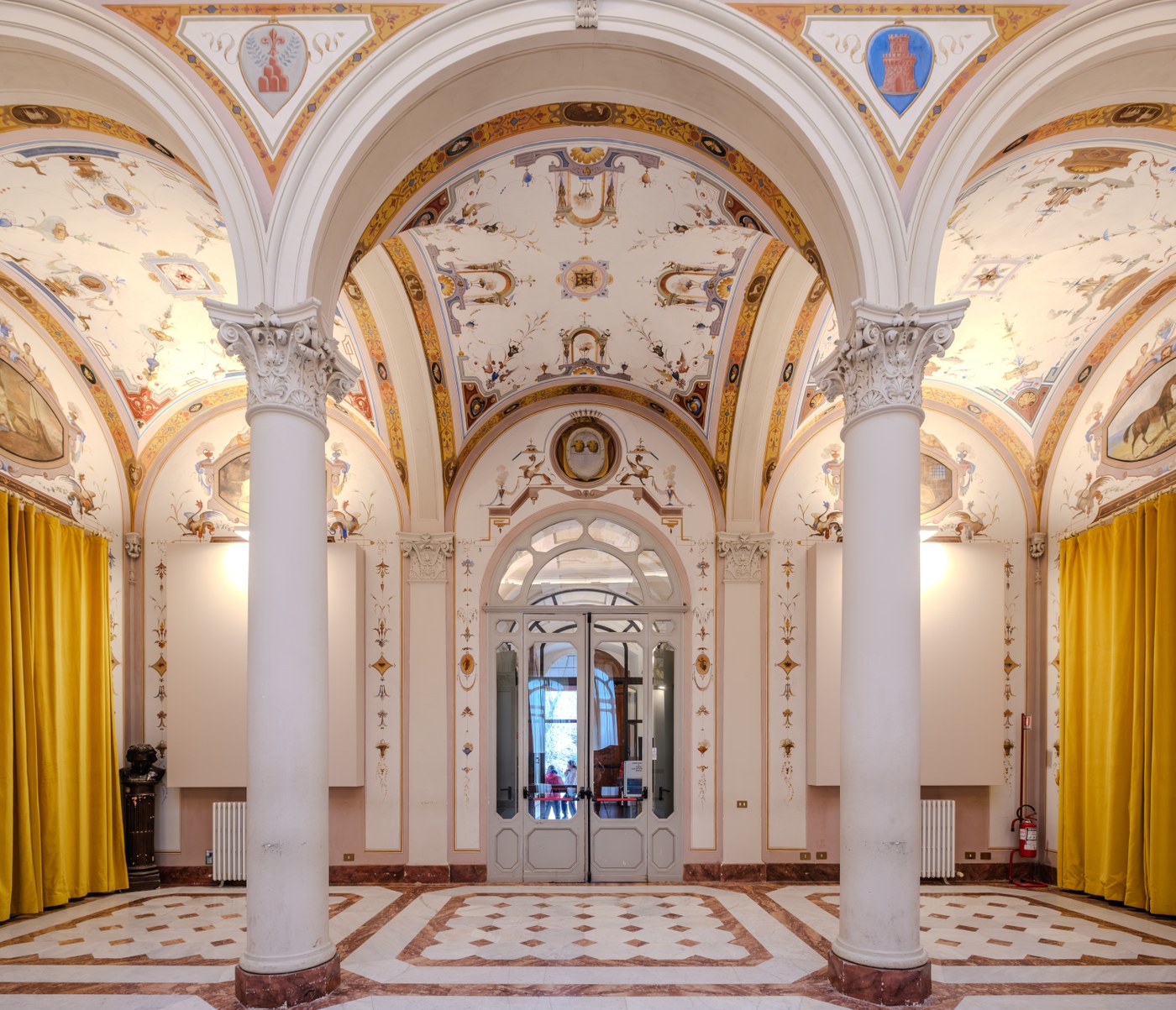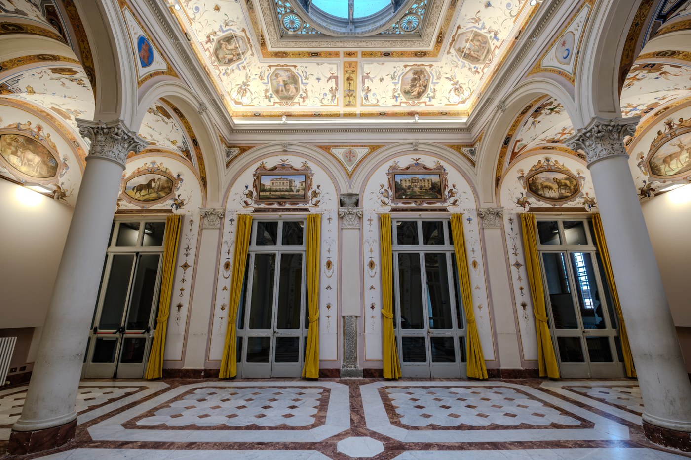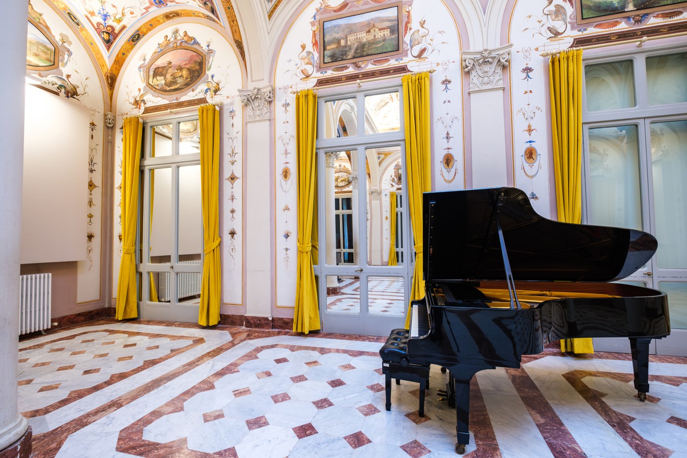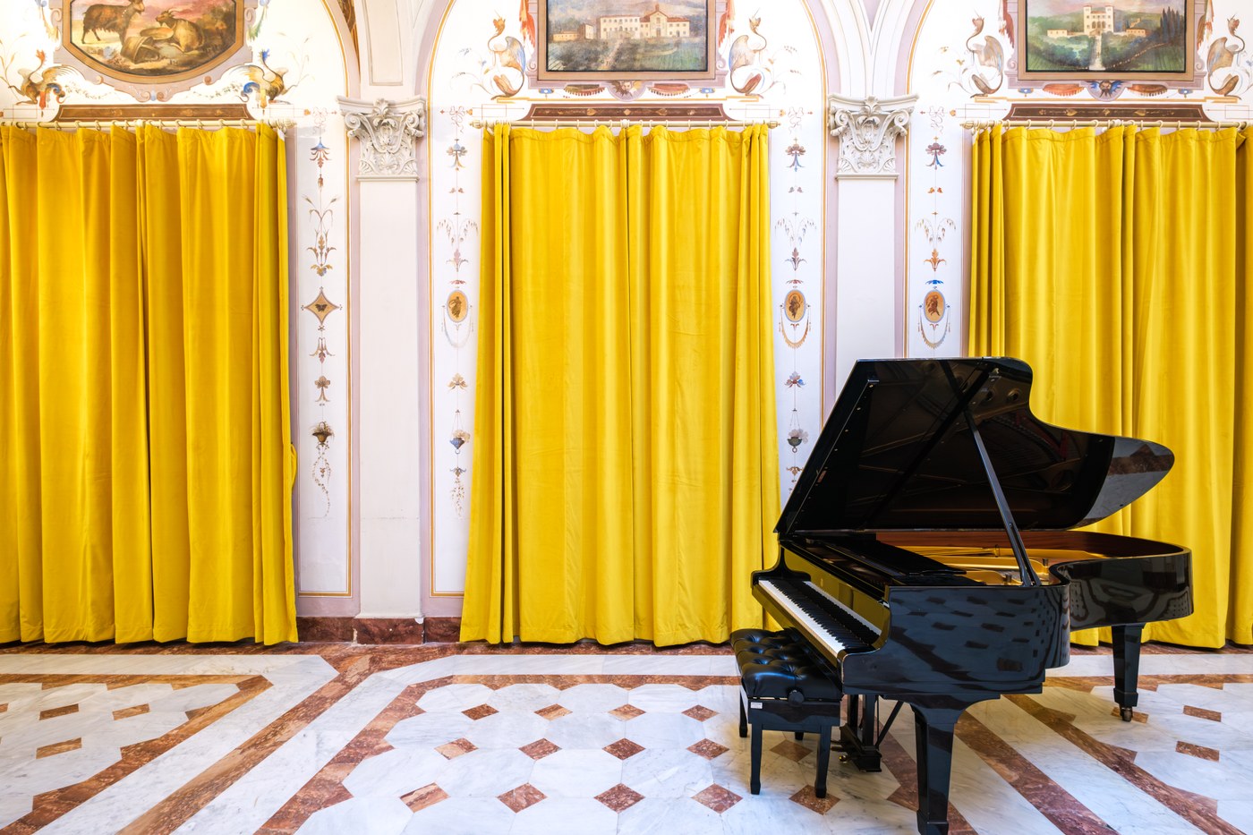 Read moreThe villa features a central hall, Sala dei Giochi, which is now used as an auditorium for Conservatory lectures and concerts. It had complex acoustics because of the central skylight that focused sound toward the center of the hall. It was treated with broad-band absorbers to contain low frequencies and with Plexiglas canopies to eliminate the phenomenon of sound focusing. The treatment is completed with a series of fire retardant velvet curtains that also give the ability to create variable acoustics in the room, which is useful for being able to play classical, opera, and even electronic works of music.