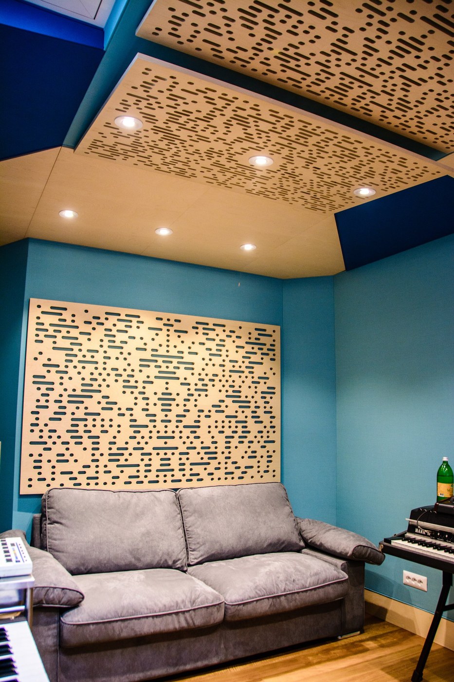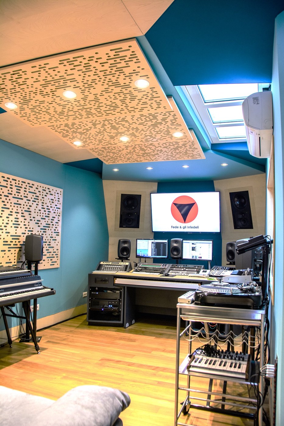Lo studio di Federico de Robertis è il nostro esempio più palese: il vecchio studio “Loculo” è letteralmente rinato nel nuovo “Aldilà” che di celestiale non ha solo il nome. Una piccola regia ma di grande qualità, con monitor Genelec in wall, strumentazioni allo stato dell'arte e una risposta acustica ottimale su tutto lo spettro di frequenze. I pannelli sul soffitto e sulle pareti hanno una foratura particolare ottenuta da algoritmi matematici che permette una diffusione ottimale del suono (binary amplitude diffusers). Una visiva mette in comunicazione la regia con una piccola sala di ripresa.