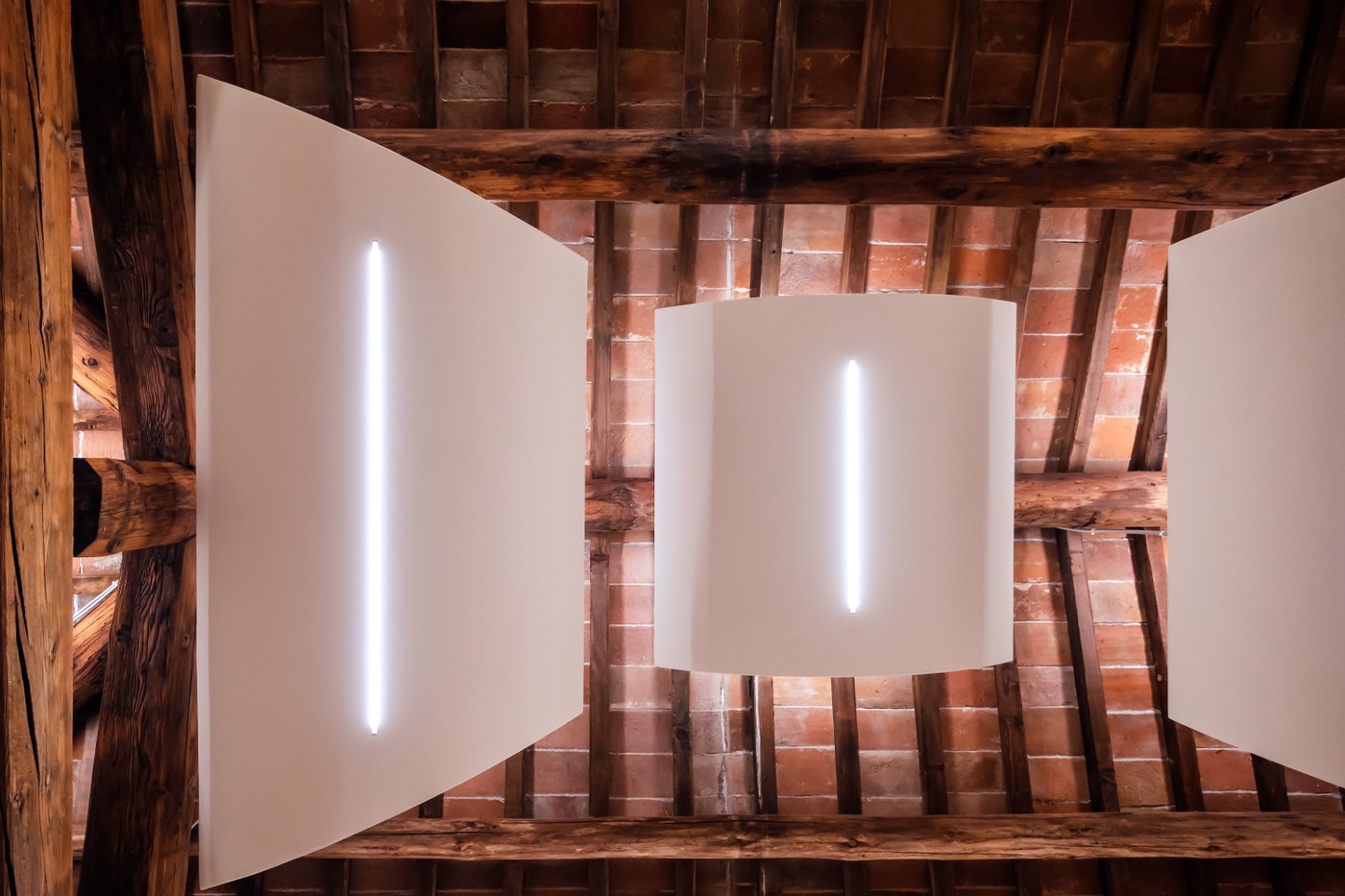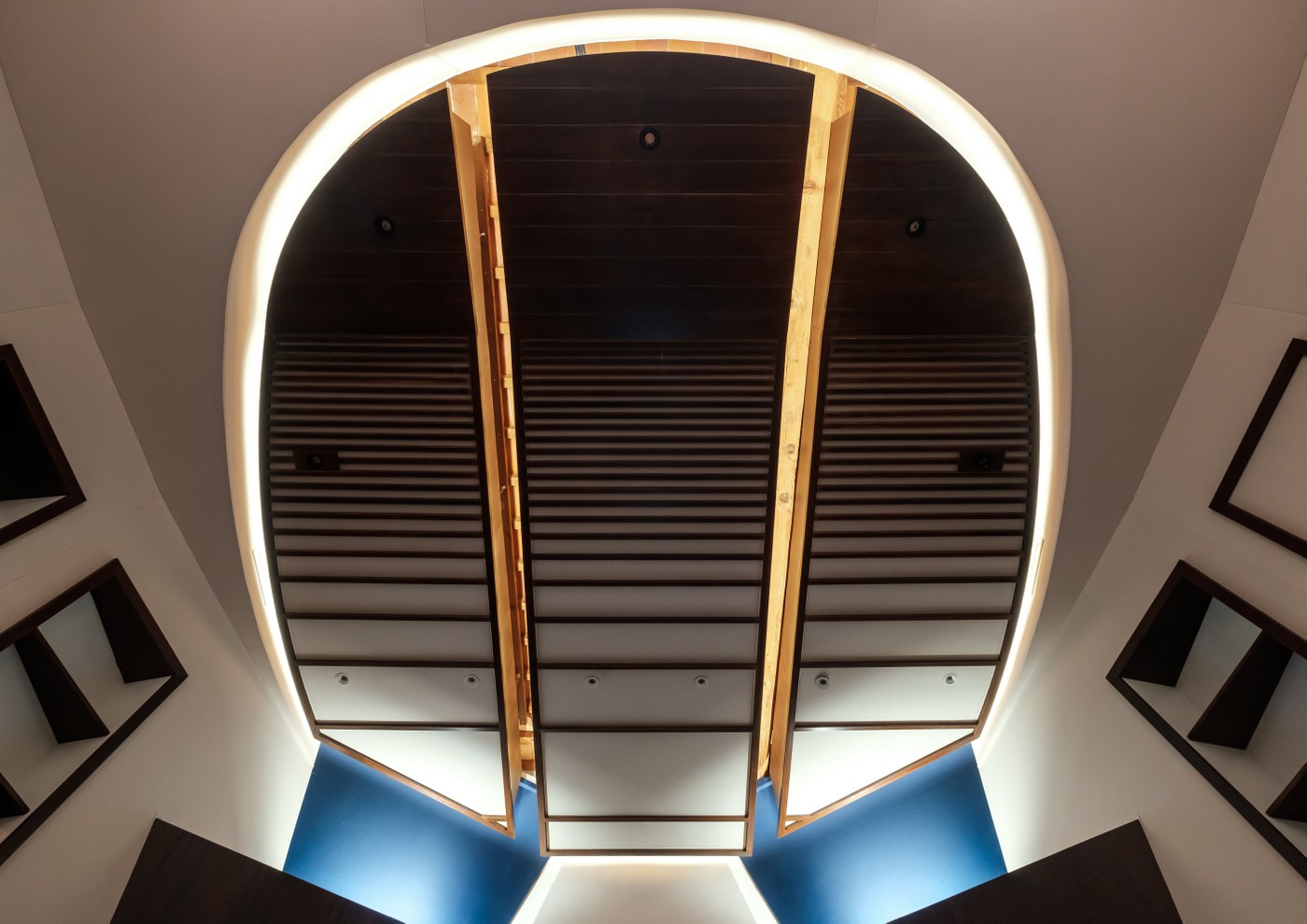 Il “cloud” del soffitto nasconde un grande strato di materiale assorbente che assorbe le basse frequenze, equilibrando la risposta in frequenza. La parte riflettente del soffitto indirizza il suono proveniente dalle casse verso la parete di fondo, da cui viene adeguatamente assorbito/ridiffuso. Al punto di ascolto non arriva nessuna riflessione differita che possa confondere la percezione.