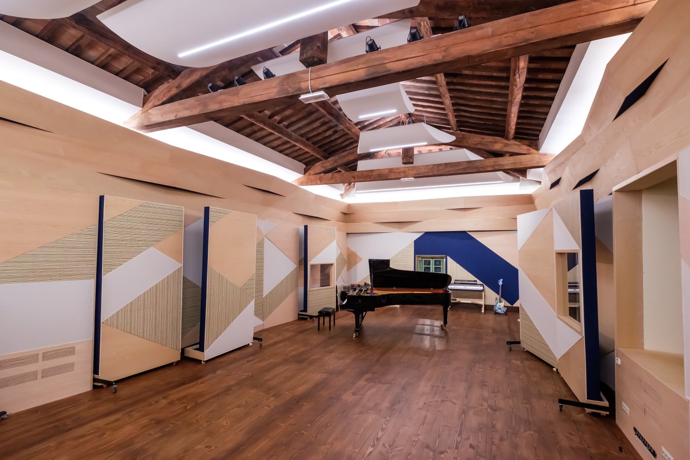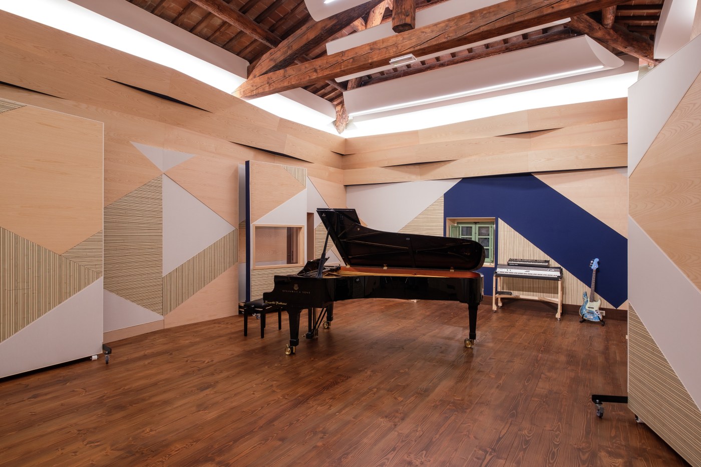 La sala di ripresa è una delle più grandi disegnate da Studio Sound Service. Come la regia, anche questa sala è stata progettata nel dettaglio, senza lasciare niente al caso. Le “vele” a soffitto sono dispositivi con doppia funzione: aiutano a diffondere il suono proveniente dal basso e minimizzano il fenomeno di focalizzazione sonora che, altrimenti, verrebbe prodotto dalle due falde del tetto. Il pavimento è stato studiato in modo da creare zone con risposta acustica diversa, ognuna pensata per lo strumento che andrà a servire. Il disegno delle pareti è fatto in modo da fornire la giusta varietà di assorbimento, riflessione e diffusione, così da creare una riverberazione naturale, né troppo lunga, né troppo asciutta, e un campo sonoro diffuso. Il parallelismo tra le pareti lunghe, possibile causa di echi ripetuti, è stato interrotto grazie a un gioco di inclinazioni. Le pareti lunghe nascondono anche dei gobos mobili che possono essere utilizzati in modo indipendente all’interno della sala, creando zone isolate per registrazioni ad hoc.