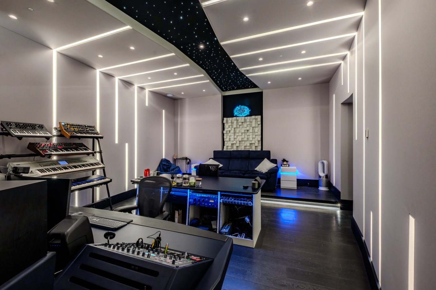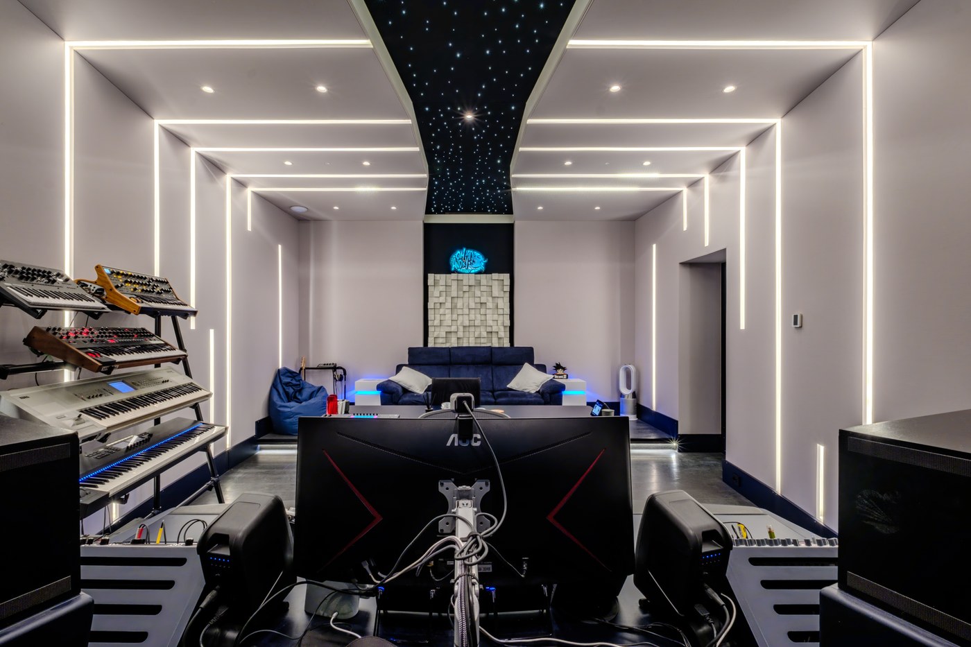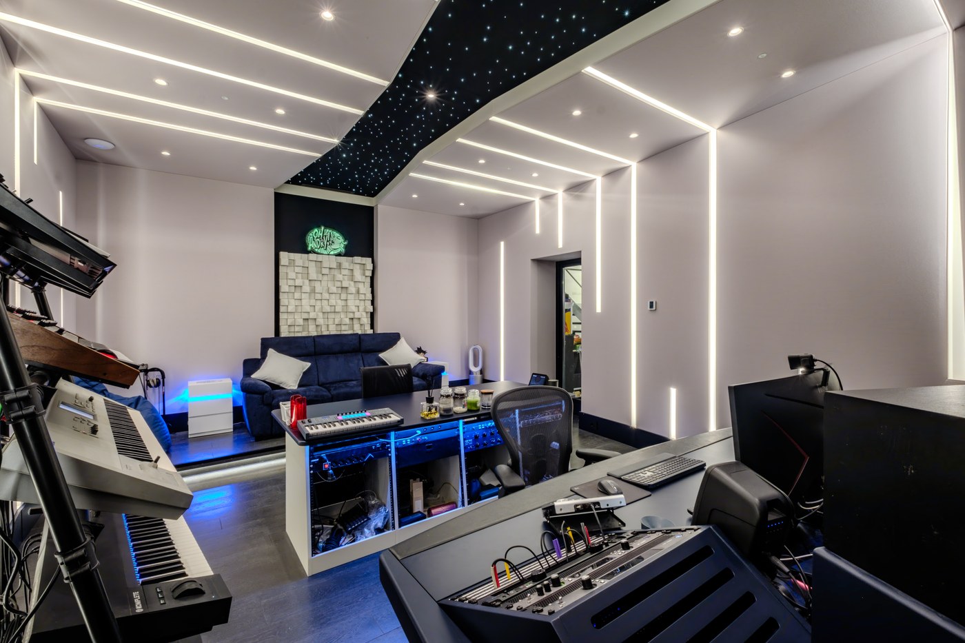 Il cuore del progetto è il fronte della sala, con un sistema di monitoraggio principale Augspurger in-wall, integrato a muro per un impatto visivo e sonoro impeccabile. In aggiunta, sono stati mantenuti i monitor nearfield Yamaha NS10 del cliente, un grande classico del settore, che si integrano perfettamente con il sistema principale per offrire massima flessibilità e precisione durante il mix. Il soffitto, un elemento di design distintivo, include una striscia centrale nera con un sistema di illuminazione a fibre ottiche che evoca un cielo stellato. Lo studio include anche un isobooth, una saletta di ripresa acusticamente "asciutta" e ottimizzata specificamente per la registrazione delle voci, garantendo la massima libertà al cliente in fase di post-produzione.