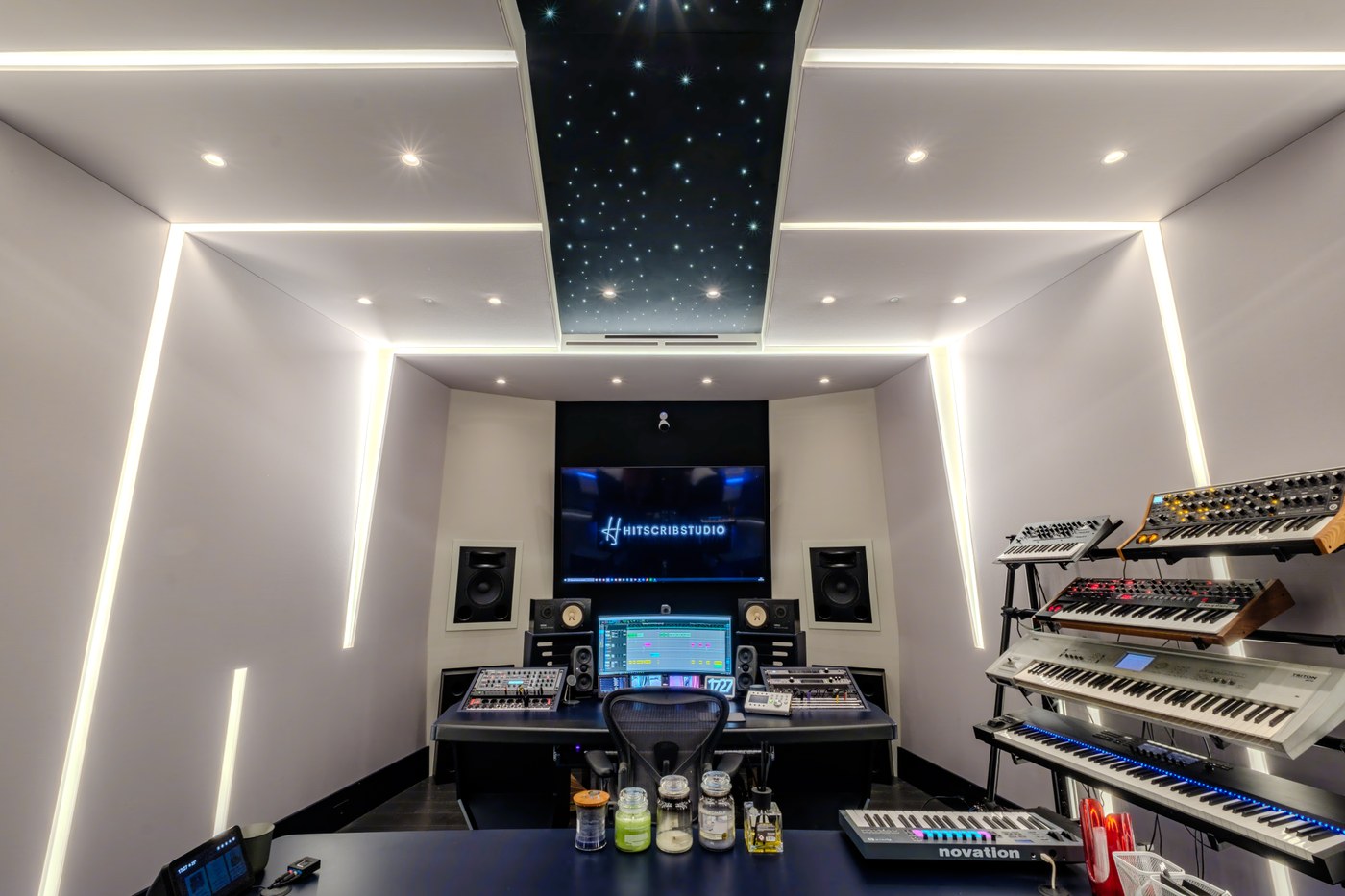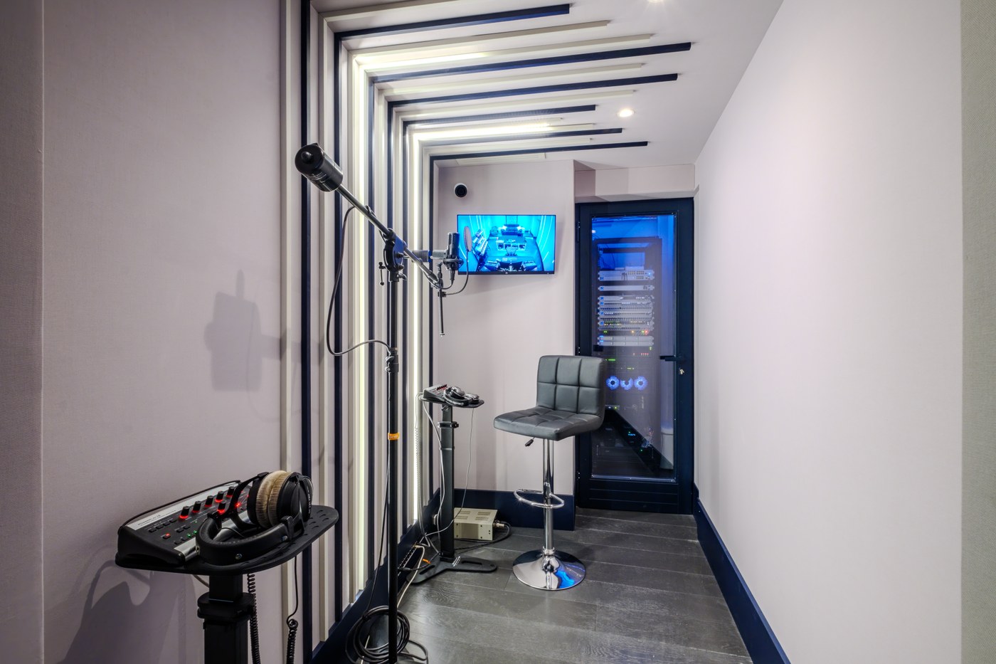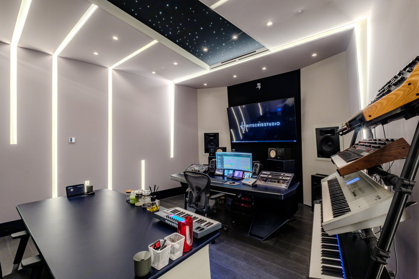 Il cuore del progetto è il fronte della sala, con un sistema di monitoraggio principale Augspurger in-wall, integrato a muro per un impatto visivo e sonoro impeccabile. In aggiunta, sono stati mantenuti i monitor nearfield Yamaha NS10 del cliente, un grande classico del settore, che si integrano perfettamente con il sistema principale per offrire massima flessibilità e precisione durante il mix. Il soffitto, un elemento di design distintivo, include una striscia centrale nera con un sistema di illuminazione a fibre ottiche che evoca un cielo stellato. Lo studio include anche un isobooth, una saletta di ripresa acusticamente "asciutta" e ottimizzata specificamente per la registrazione delle voci, garantendo la massima libertà al cliente in fase di post-produzione.