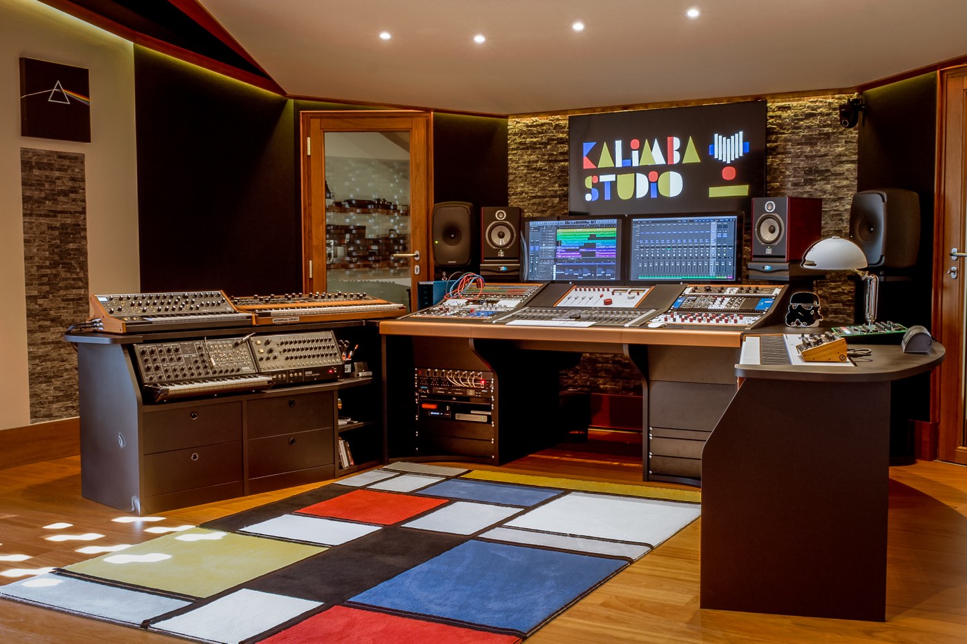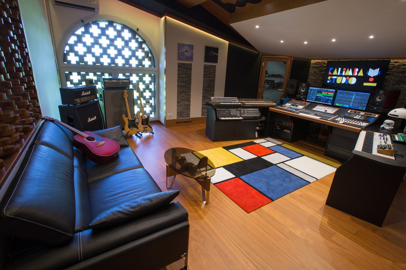 La sala di regia di Kalimba Studio ha una superficie molto estesa ed è fornita di hardware di primo livello, analogico e digitale, oltre che di una vasta collezione di synth analogici vintage e moderni. È stata ricavata in un sottotetto, ed è stata sfruttata l’inclinazione naturale del tetto per ottimizzare le riflessioni del suono nello spazio.