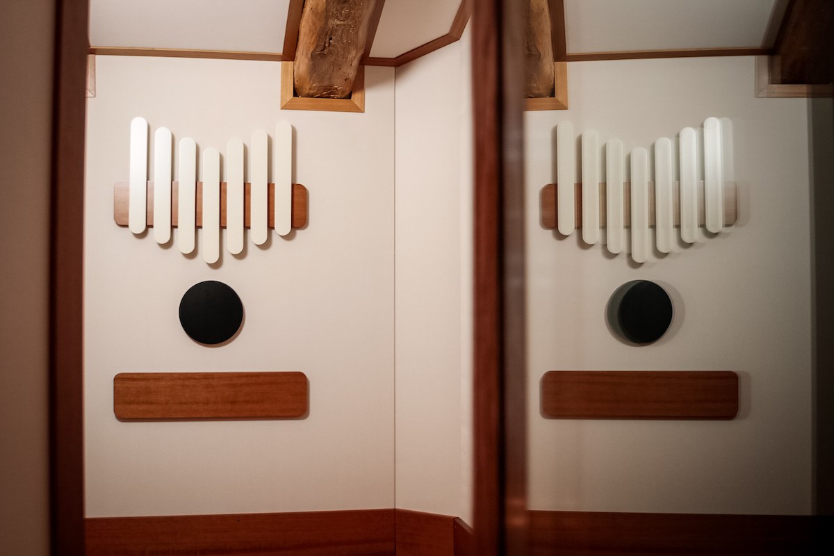 Il soffitto è rivestito da pannelli policilindrici in legno di mogano che riflettono omogeneamente il suono in tutto l’ambiente e, insieme agli altri dispositivi di diffusione acustica e alla parete in pietra ricostruita, garantiscono un perfetto controllo tonale della riverberazione.