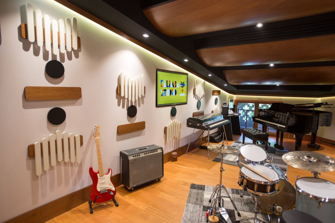 Il design acustico della regia di Kalimba Studio è di tipo “non-environment”, con un fronte riflettente e il retro e il soffitto con un grande strato di assorbimento, per minimizzare gli effetti delle onde stazionarie.