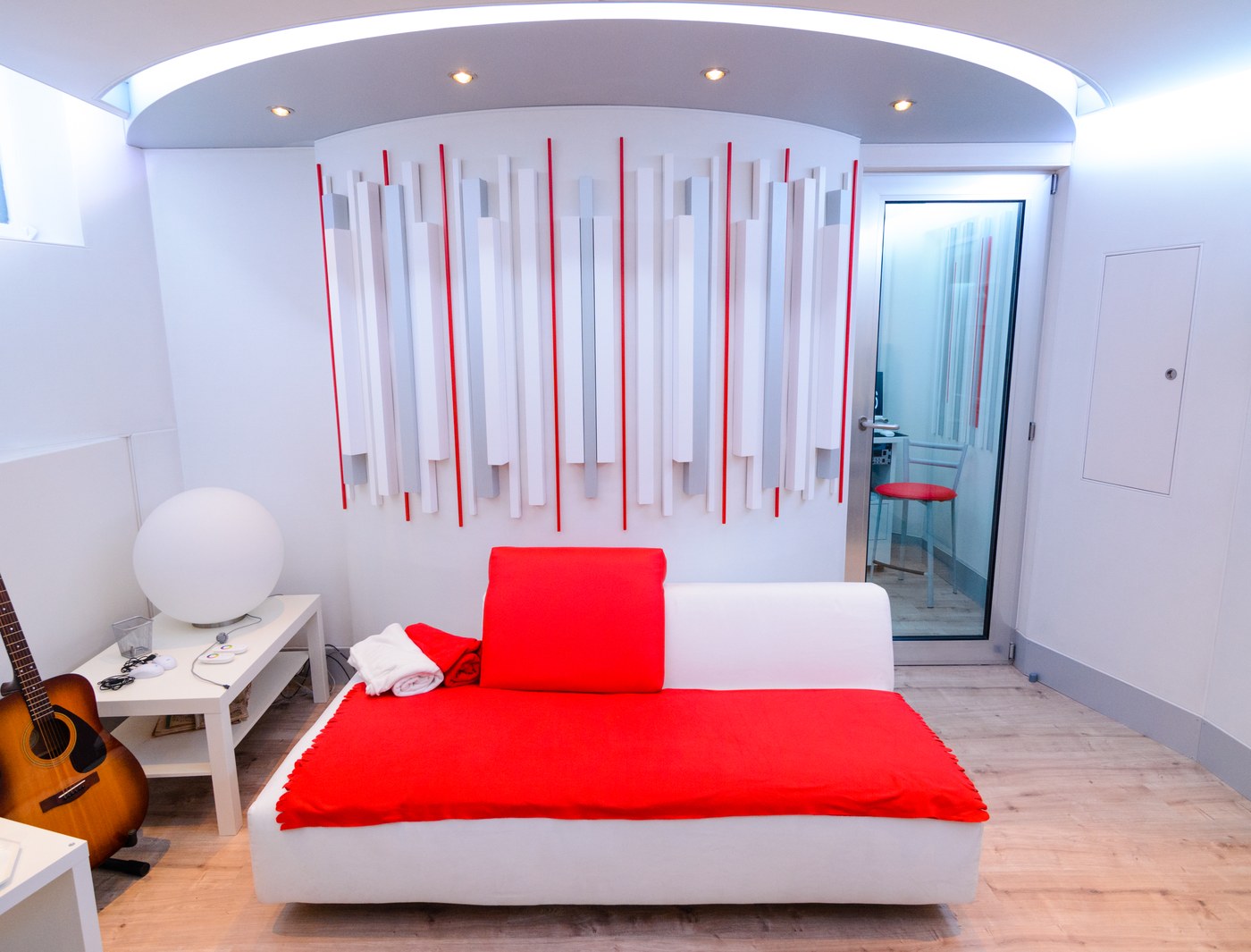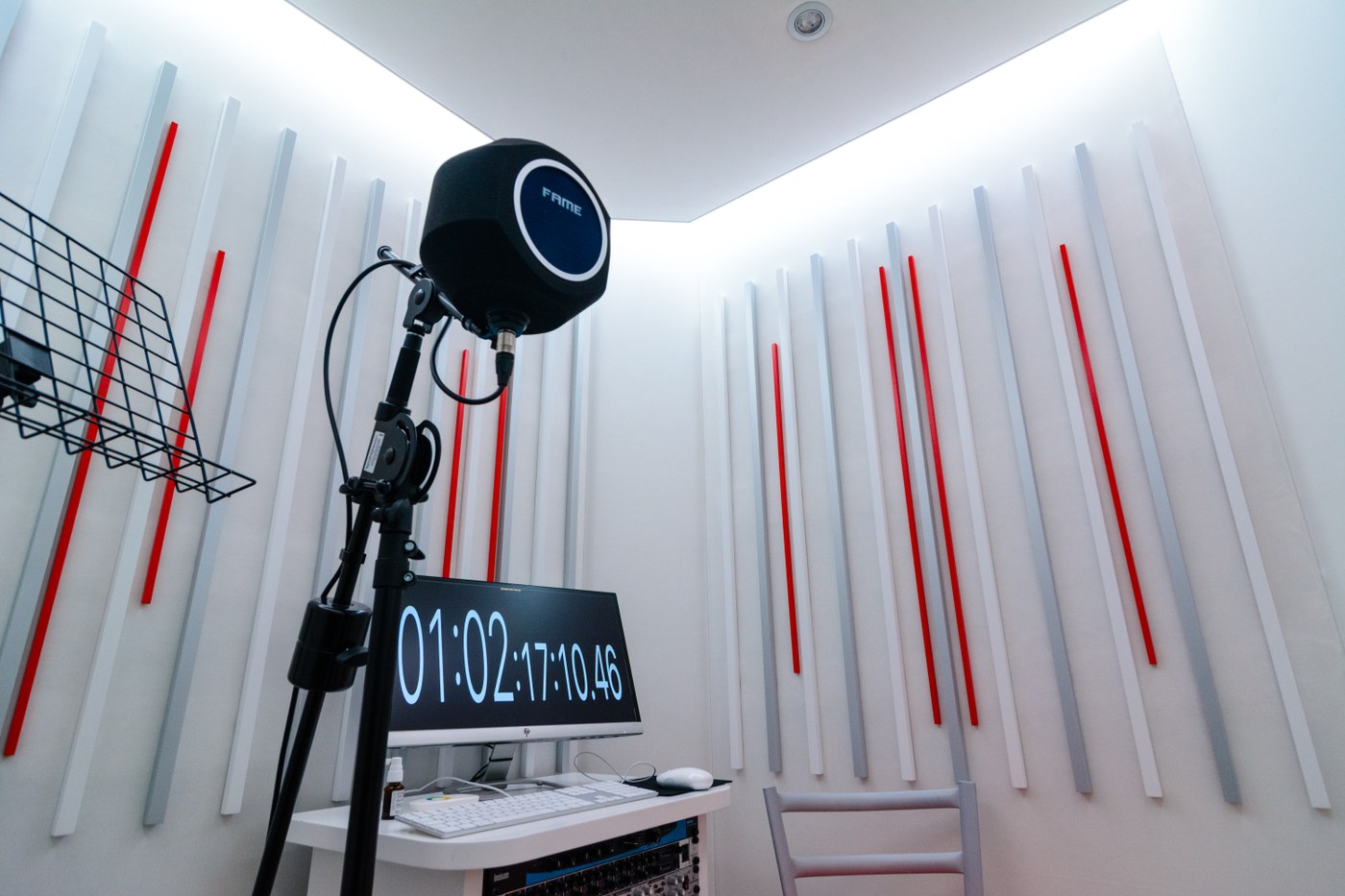 La sfida principale è stata quella di trasformare uno spazio domestico con limiti di altezza e dimensioni in un ambiente acusticamente funzionale. La nostra progettazione, curata in collaborazione con Lapo Consortini (consulente per la parte elettronica) e il cablaggio di Luca Ravagni, ha creato un'estetica moderna e pulita, con colori chiari che ne amplificano la percezione dello spazio.